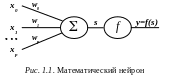 Формальный нейрон. (рис.1.1). Он состоит из элементов трех типов. Элементы нейрона - умножители (синапсы), сумматор и нелинейный преобразователь. Синапсы осуществляют связь между нейронами, умножают входной сигнал на число, характеризующее силу связи, - вес синапса. Сумматор выполняет сложение сигналов, поступающих по синоптическим связям от других нейронов, и внешних входных сигналов. Нелинейный преобразователь реализует нелинейную функцию одного аргумента - выхода сумматора. Эта функция называется "функция активации" или "передаточная функция" нейрона. Нейрон в целом реализует скалярную функцию векторного аргумента.
