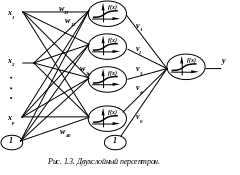 Одними из наиболее распространенных являются многослойные сети, в которых нейроны объединены в слои. Слой - это совокупность нейронов c единым входным сигналом. В качестве основного примера рассмотрим сеть, которая достаточно проста по структуре и в то же время широко используется для решения прикладных задач — двухслойный персептрон с p входами и одним выходом (рис. 2.3).