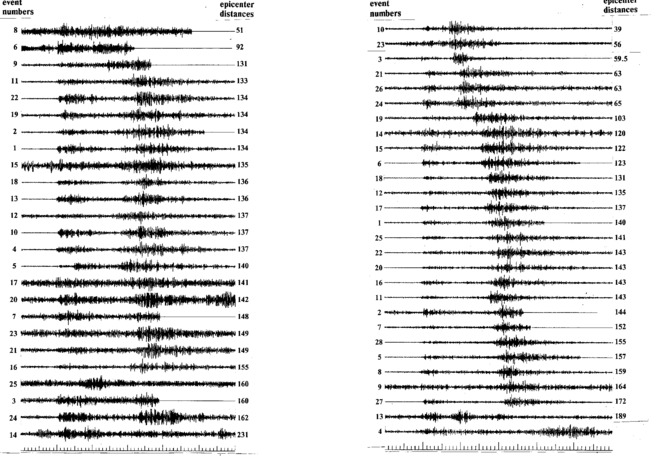 В левом столбце представлены сейсмограммы, описывающие взрывы, а в правом – землетрясения.