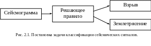 Одна из многочисленных задач, возникающих при региональном мониторинге, это задача идентификации типа сейсмического источника или задача классификации сейсмических сигналов. Она состоит в том, чтобы по сейсмограмме определить причину возникновения зафиксированного события, т.е. различить взрыв и землетрясение. Ее решение предусматривает разработку определенного метода (решающего правила), который с определенной вероятностью мог бы отнести записанное событие к одному из двух классов. На рис.2.1 представлена схема постановки задачи.