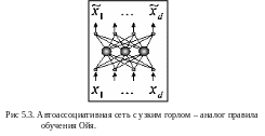В теории нейронных сетей разработаны более мощные алгоритмы, осуществляющие “нелинейный анализ главных компонент”[3]. Они представляют собой самостоятельную нейросетевую структуру, которую обучают выдавать в качестве выходов свои собственные входные данные, но при этом в ее промежуточном слое содержится меньше нейронов, чем во входном и выходном слоях. (рис 5.3). Сети подобного рода носят название – автоассоциативные сети.