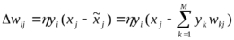 Чтобы восстановить свои входные данные, сеть должна научиться представлять их в более низкой размерности. Базовый алгоритм обучения в этом случае носит название правило обучения Ойя для однослойной сети. Учитывая то, что в такой структуре веса с одинаковыми индексами в обоих слоях одинаковы, дельта-правило обучения верхнего (а тем самым и нижнего) слоя можно записать в виде: