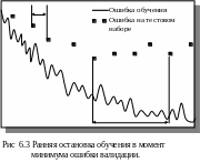 Самым простым является первый метод. Он предусматривает вычисление во время обучения не только ошибки обучения, но и ошибки валидации, используя ее в качестве контрольного параметра. В самом начале работы ошибка сети на обучающем и контрольном множестве будет одинаковой. По мере того, как сеть обучается, ошибка обучения, естественно, убывает, и, пока обучение уменьшает действительную функцию ошибок, ошибка на контрольном множестве также будет убывать. Если же контрольная ошибка перестала убывать или даже стала расти, это указывает на то, что сеть начала слишком близко аппроксимировать данные и обучение следует остановить. Рисунок 6.5 дает качественное представление об этой методике.