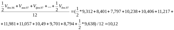рассчитать средний объем продаж за месяц по данным 13 месяцев, для которых июнь 1998 г. лежит в середине ряда. Использование 13 месяцев позволяет центрировать месяц, для которого производятся расчеты. В нашем примере средняя будет рассчитываться по формуле средней хронологической по следующим данным (с декабря 1996 г. по декабрь 1997 г.):