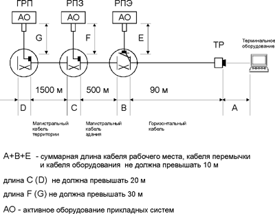 Длины смонтированных кабелей магистральной и горизонтальной подсистем не должны превышать предельных значений. Эти значения приведены на рисунке.