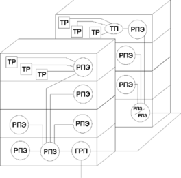 Функции распределительных пунктов разного типа могут быть объединены в одном. На рисунке изображен пример.