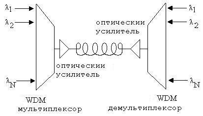 Указанная выше задача успешно решается с помощью оптического мультиплексирования с разделением по длинам волн — WDM (Wavelength Division Multiplexing). Суть этого метода состоит в том, что m информационных цифровых потоков, переносимых каждый на своей оптической несущей на длине волны λm и разнесенных в пространстве, с помощью специальных устройств — оптических мультиплексоров (ОМ) — объединяются в один оптический поток λ1..λm, после чего он вводится в оптическое волокно. На приемной стороне производится обратная операция демультиплексирования. Примерная структурная схема такой системы с WDM представлена на рис. 1.1.