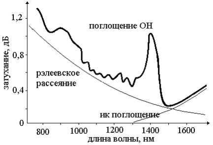 По мере распространения света в оптической среде он ослабевает, что носит название затухания среды — затухания ОВ. Затухание зависит от длины волны излучения, вводимого в волокно. В настоящее время передача сигналов по волокну осуществляется в трех диапазонах: 850 нм, 1300 нм, 1550 нм, так как именно в этих диапазонах кварц имеет повышенную прозрачность. Затухание (рис. 3.1) обычно измеряется в дБ/км и определяется потерями на поглощение и на рассеяние излучения в оптическом волокне [5]:
