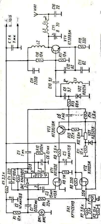 Звуковой сигнал с электретного микрофона ВМ1 поступает на вход микрофонного усилителя, собранного на операционном усилителе (ОУ) DA2. Питание микрофон получает через резистор R1 и развязывающую цепь R5C2. Для снижения потребляемой мощности на месте DA2 использован микромощный ОУ К140УД12. Резистор R10 задает потребляемый ток ОУ около 0,2 мА. Большой мощности от микрофонного усилителя не требуется, потому что он нагружен на варикап, а мощность управления варикапом, представляющим собой обратносмещенный диод, крайне мала R7 и сопротивление участка сток—исток полевого транзистора VT1 образуют цепь отрицательной обратной связи, определяющей коэффициент усиления микрофонного усилителя. Канал полевого транзистора VT1 служит регулируемым сопротивлением в системе АРУ. При напряжении затвор—исток, близком к нулевому, сопротивление канала — около 1 кОм и коэффициент усиления микрофонного усилителя близок к 100. При возрастании напряжения до 0,5... 1 В сопротивление канала повышается до 100 кОм а коэффициент усиления микрофонного усилителя уменьшается до 1. Это обеспечивает почти неизменный уровень сигнала на выходе микрофонного усилителя при изменении уровня сигнала на его входе в широких пределах.