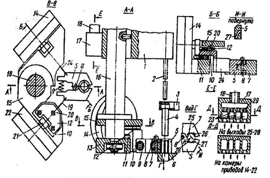 Если валик 4, перемещаясь вниз, не попадает в отверстие детали 6, а упирается в ее торец, то толкатель 2 смещается относительно консоли вверх и открывает золотник (на рисунке не показан), который открывает подачу сжатого воздуха в распределитель 17. Последний связан с воздушной магистралью посредством штуцера 18.