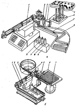 Рис. 2.28. Компоновка РТК: а – для сборки клапанов; б – для укладки заготовок постоянных магнитов в кассеты