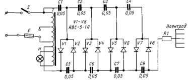 Принципиальная электрическая схема аппарата приведена на рис. 3. Выпрямитель собран по схеме восьмикратного умножения напряжения на селеновых столбах V1-V8 и конденсаторах С1-С8. Отрицательный полюс выпрямителя через ограничительный резистор R1 соединен с электродом.