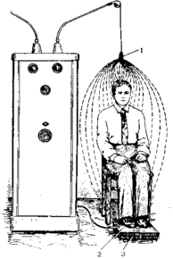 Франклинизация проводится в виде общей или местной процедуры. При общем воздействии (рис. 1) пациент усаживается на стул, касаясь ногами (при снятой обуви) металлического листа 2, соединенного с одним из полюсов источника высокого напряжения. Над головой больного устанавливается второй электрод 1 в виде звезды или полусферы, усаженный остриями, и соединенный с другим полюсом источника высокого напряжения.
