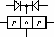 Щоб краще зрозуміти принцип роботи цього приладу уявімо собі напівпровідник у якого є два p-n переходи (рис. 11). Якщо відстань між цими p-n переходами є великою, тобто коли при подоланні цієї відстані електрони і дірки встигають рекомбінувати, то в такому випадку матимемо справу з зустрічним з’єднанням двох напівпровідникових діодів.
