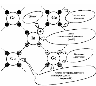 Уявимо собі іншу картину: в чистий напівпровідник введено домішку атом якої, на зовнішній орбіті, має три електрони (рис.7). Оскільки в даному випадку, щоб заповнити усі зв'язки в кристалі, не вистачає одного електрона, то порожнє місце може заповнити один із сусідніх електронів. Такий провідник матиме діркову провідність (р- провідник, від лат. “positive”, тобто позитивний).