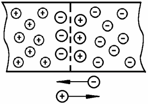 Електрони та дірки можуть вільно переходити через межу поділу провідності. Оскільки в лівій частині напівпровідника є велика кількість дірок, то вони вирушать у праву, а електрони – навпаки, у ліву. Потрапивши до лівої частини з р–провідністю, електрони почнуть рекомбінувати з дірками.