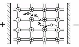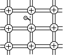 Чи може протікати електричний струм в такій речовині? Виявляється, все залежить від того, як стійко тримаються електрони на орбіті. Якщо орбіти електронів у речовині дуже стійкі і електрони не полишають їх за жодних умов (при підвищенні температури, прикладенні до куска матеріалу різниці потенціалів), то ця речовина є типовим ізолятором. Характерною ж властивістю напівпровідників є те, що електрони, в цих матеріалах, можуть залишати свої орбіти внаслідок дії світла, тепла, електричного поля тощо. Схематично, уявимо собі кристал напівпровідника так, як це зображено на рис. 4. Припустимо, що один з електронів покинув свою орбіту і полетів у міжатомний простір матеріалу. Якби до напівпровідника прикласти різницю потенціалів, то електрон полетів би у напрямку позитивного електрода (природа походження такого електричного струму притаманна звичайному провіднику).
