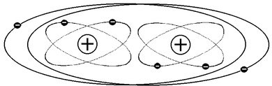 Найпростішу модель молекули зображено на рис. 2. У цій молекулі сполучені два однакові атоми, причому навколо ядра кожного атома обертаються “свої” електрони, а два електрони обертаються навколо обох ядер водночас. Вони є начебто спільними для обох атомів і об’єднують їх в молекулу.
