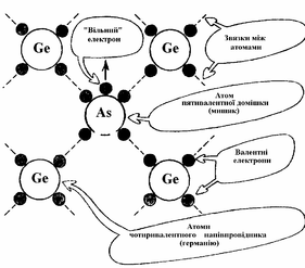 Описане явище провідності в напівпровідниках має місце лише в чистих матеріалах. Що ж зміниться, коли в чистий напівпровідник потрапить атом, який має на орбіті не чотири електрони, а п'ять? Ясна річ, чотири електрони одразу ж займуть місце на спільних з сусідніми атомами орбітах. А п'ятий електрон виявиться зайвим, і він вирушить в міжатомний простір речовини, оскільки його ніщо на тримає біля свого атома. Незважаючи на те, що атом домішки буде, у цьому випадку, позитивно зарядженим, однак дірки тут немає (рис.6).