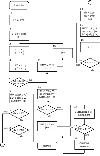 Так как в данной реализации максимальный размер приращения не может превышать величину int/2 (15 двоичных разрядов), блоки 7 и 8 осуществляют проверку на превышение текущего приращения относительно заданного. Максимальный размер приращения в int/2 принят исходя из сокращения объема памяти УП, т.к подавляющее большинство отрезков прямых полилиний, образующих рисунок, не превышают отмеченный порог.