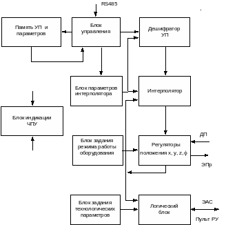 Приведенная схема отличается от классической отсутствием в структуре ЧПУ интерпретатора УП, и её функции возложены на CAM-систему информационно-управляющей оболочки ЭВМ верхнего уровня.