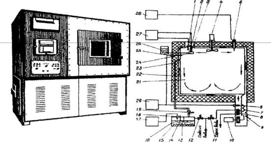 Рисунок 3 - Внешний вид и схема камеры тепла и влаги КВТ-0,4-155: 1 - сухой термометр; 2 - мокрый термометр; 3 - чехол; 4,10 - вентиляторы; 5,6,18,25 - платиновые термометры сопротивления; 7,15 - нагреватели; 8 - змеевик; 9 - заслонка; 11,12,19 - соленоидные вентили; 13,14 - датчики уровня воды; 16 - паровой увлажнитель; 17,20,27,28 - электронные мосты; 21 - полезный объем камеры; 22 - пространство для циркуляции воздуха; 23 - пароотвод; 24 - стакан подпитки; 26 - емкость с дистиллированной водой.