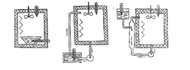 Для обеспечения требуемой влажности воздуха в испытательных камерах применяется ряд способов (рисунок 1). Наиболее простым является открытый способ, воспроизводящий природные условия увлажнения. Его недостатком является трудность поддержания необходимого режима. Характерной особенностью закрытых способов увлажнения является рециркуляция воздуха из рабочего объема камеры через увлажнительное устройство. В увлажнителе воздух либо продувается через слой подогретой воды, либо смешивается с распыленной водой (рисунок 2). Иногда для имитации быстрых суточных изменений температуры и влажности воздуха в испытательный объем вводится водяной пар.