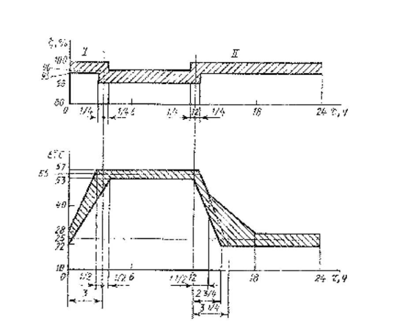 I - конец подъема температуры; II - начало падения температуры; т - 1/4 ч. - время, в течения которого не допускается конденсация влаги в изделиях