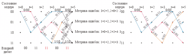 После получения такого дибита уже не существует пути с метрикой накопленных ошибок, равной 0. Однако при этом возникнут два альтернативных пути с метрикой, равной 1. Поэтому выяснить на данном этапе, какой бит исходной последовательности соответствует полученному дибиту, невозможно.