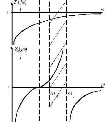 Воспользуемся условиями фильтрации для характеристического затухания. Для этого вычертим графики частотной зависимости реактивных сопротивлений Z1/j, Z2/j и определим область, где они имеют разные знаки, кроме того, |Z2|>|Z1|. На рисунке 12 эта область заштрихована.