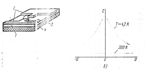 Тангенс угла диэлектрических потерь таких диэлектриков (параэлектриков) при температурах ниже 80 К сильно зависит от внешнего электрического поля. Активный элемент пароэлектрического усилителя представляет собой конденсатор, заполненный параэлектриком, помещенным в электромагнитное поле (накачка). Емкость конденсатора периодически изменяется с частотой накачки, что позволяет осуществить параметрическое усиление (рис.9.30). На рис.9.30, а приведена структура активного элемента параэлектрического усилителя, а на рис.9.30,6 - зависимость его емкости от напряжения при температуре 4,2 К. Пунктиром показана эта же зависимость при нормальной температуре (300 К).