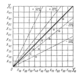 Проведя на графике лучи соответствующие, например 20- и 50 %-ному изменению параметра за время испытаний, нетрудно подсчитать число точек (изделий), попавших в сектор между двумя лучами: с изменением параметра до 20 % и от 20 до 50 % от первоначального значения.
