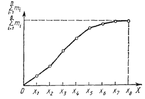 Для получения гистограммы на интервалах, отложенных по оси абсцисс, строят прямоугольники, высоты которых пропорциональны частотам интервалов. Кумулятивная кривая (рис. 3) применяется для изображения экспериментальных значений ПКГ с накопленными частотами в прямоугольной системе координат.