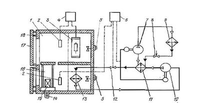 В испытательных камерах необходимый тепловой режим и равномерность температуры по объему камеры обеспечивается размещением нагревательных элементов на дне, в стенках и двери камеры или подачей нагретого воздуха (теплоносителя) внутрь металлической рубашки, окружающей полезный объем. Получение низких температур может достигаться двумя способами: непосредственным охлаждением с помощью охлаждающего агента (жидкого азота двуокиси углерода, аммиака), а также косвенным охлаждением с помощью компрессорной установки. Косвенный способ охлаждения основан на свойстве жидкости при испарении поглощать тепло из окружающей среды. Техническая реализация данного способа основана на применении компрессионной испарительной системы, в одной части которой газообразный хладоагент (фреон) сжимается до давления, обеспечивающего конденсацию, а в другой части - быстро расширяется. Охлаждающий агент в установке используется продолжительное время, так как он циркулирует в замкнутой системе.