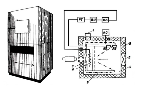 Размещение датчиков контроля температуры при испытании терморассеивающих изделий должно учитывать возможность исключения взаимного влияния изделий друг на друга с тем, чтобы при установлении температурного режима выходные измерительные приборы показывали истинную температуру. Внешний вид камер и их схематическое изображение, поясняющее принцип работы, показаны на рисунках 1, 2, 3.