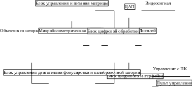 На рис. 1 приведена обобщенная структурная схема современной тепловизионной системы «смотрящего» типа с микроболометрической матрицей. Применяемые микроболометрические матрицы снабжены системой поддержания температуры на подложке чувствительных элементов. Параметры работы матрицы (уровень сигнала, чувствительность, внутренняя температура) задаются набором входных напряжений, поступающих с блока управления и питания матрицы. Для проведения калибровки предусмотрен узел шторки, расположенный между объективом и матрицей. В некоторых системах предусмотрена система фокусировки по получаемому изображению. Микроболометрическая матрица формирует аналоговый сигнал, который в дальнейшем оцифровывается на АЦП. Блок цифровой обработки сигнала производит обработку оцифрованного сигнала для дальнейшего его представления на встроенном дисплее или на внешнем устройстве отображения. В данной диссертации блок цифровой обработки сигнала построен на базе программируемой логической интегральной схемы (ПЛИС), либо на базе цифрового сигнального процессора (Digital Signal Processor ‑ DSP). Настройка и управление системой производится либо с пульта управления, либо с ПК через стандартные интерфейсы.