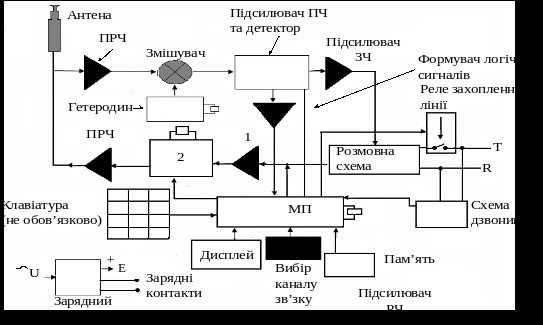 Спрощена структурна схема СБ наведена на рис. 2. У СБ входить чотири групи функціональних вузлів: приймач, передавач, інтерфейс телефонної лінії (розмовна схема) і схема управління.