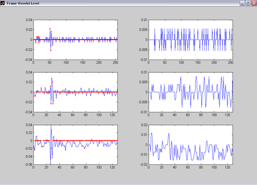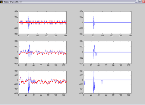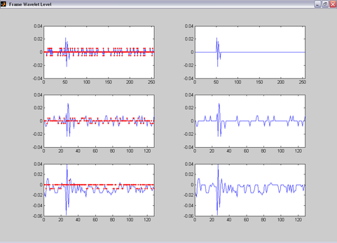 На рис. 6 слева представлены графики двух уровней вейвлет-разложения речевого сигнала (первого и второго детализирующего уровня и второго аппроксимационного уровня), а справа – графики вейлет-коэффициентов после пороговой обработки.