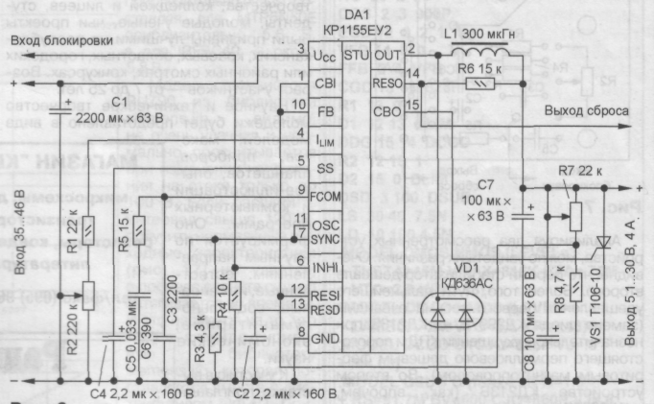 С помощью конденсатора С4 осуществляется плавный запуск стабилизатора. Кроме того, его емкость определяет период перезапуска при превышении порога защиты по току.