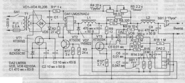 Импульсный стабилизатор напряжения на микросхеме LM2576ADJ (рис.10)