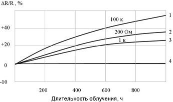 Рисунок 1 - Зависимость сопротивления тонкопленочных (1 - 3) и проволочных (4) резисторов от длительности гамма - облучения при общей дозе 2*109 Р.