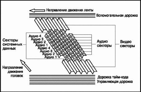Digital Betacam - этот цифровой формат видеозаписи был разработан фирмой Sony. Для записи используется та же полудюймовая лента, что и в аппаратах Betacam SP. Имеются продольные дорожки управления, режиссерская и временного кода. Все видео- и аудиосигналы записываются сегментным наклонно-строчным способом. Каждое телевизионное поле записывается на 6-ти наклонных дорожках. Соседние дорожки записываются с азимутальным разворотом рабочих зазоров видеоголовок на +/- 15 градусов. Записываемый цифровой поток составляет 125.58 Мбит/с. Digital Betacam обеспечивает запись 10-битного компонентного цифрового сигнала с соотношением частот дискретизации 4:2:2 для сигналов яркости и цветности. Поддерживаются 4 канала звукового сопровождения, частота дискретизации аудиосигнала 48 кГц при 20-битном квантовании. Миникассеты Digital Betacam обеспечивают 40 минут цифровой записи, а большие - более 2-х часов.