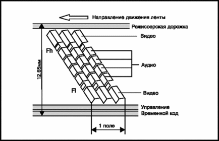 D1 - цифровой формат, разработанный фирмой Sony. Запись осуществляется на магнитную ленту шириной 19,01 мм в соответствии со стандартом CCIR601 в варианте 4:2:2. Запись видео- и аудиосигналов сегментная, четырехканальная; скорость движения ленты - 286,9 мм/с. Одно телевизионное поле записывается на 12 наклонных дорожках шириной 30 мкм. Кроме наклонных дорожек имеются 3 продольные - монтажная звуковая дорожка, дорожка управления и дорожка временного кода. В центре наклонных дорожек для записи видеоданных размещены 4 сектора с сигналами звука. Запись производится на кассеты трех размеров, которые обеспечивают 11, 34, 76 минут непрерывной записи при толщине ленты 16 мкм. При меньшей толщине ленты длительность записи, соответственно, увеличивается.