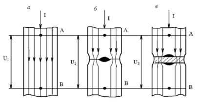 Для сплошного проводника электрическое сопротивление постоянному току Rv определяется на основании известного закона Ома. Для двух соединенных металлических проводников одинакового сечения и материала электрическое сопротивление контакта