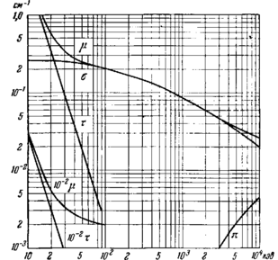 Ослабление гамма-лучей в антрацене, ц - коэффициент ослабления; ф - коэффициент фотопоглощения, а - коэффициент комптоновского рассеяния, р - коэффициент образования пар.