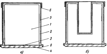 Крепление кристалла: а) сплошной кристалл, б) кристалл с просверленным отверстием; 1 - сцинтиллятор), 2-рефлектор, 3 - оптический контакт, 4 - стеклянное окно, S - алюминиевый кожух, 6 - замазка.