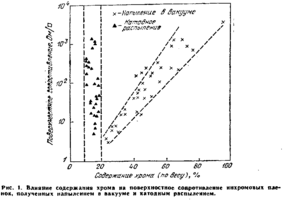 Рисунок 1 - Влияние содержания хрома на поверхностное сопротивление нихромовых пленок, полученных напылением в вакууме и катодным распылением.