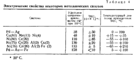 1) Удельное сопротивление сплавов. Сплавы металлов даже в массивном образце редко имеют удельное сопротивление больше 20—30 мкОм*см. Исключение составляют лишь гафний (30,6 мкОм*см), цирконий (42,4 мкОм* см), титан (43,1 мкОм* см) и марганец (139 мкОм*см), для которых приведенные величины сопротивления получены при 22°С. Некоторые виды сплавов имеют удельное сопротивление порядка 160 мкОм*см; они-то и используются в производстве дискретных резисторов. Одним из их параметров является весьма низкнй ТКС, правда в ограниченном, но в рабочем для радиоэлектронной аппаратуры температурном диапазоне. Результаты исследований в этом направлении были обобщены Джексоном и др. В табл. 2 приводятся свойства некоторых сплавов.