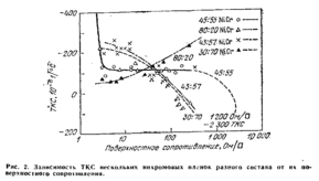 Кемпбелл и Хендри сообщили об одной интересной взаимосвязи между величиной ТКС и составом пленок нихрома. Они обнаружили, что ТКС становится все более отрицательным для пленок с высоким содержанием хрома, и подобрали состав пленки и условия, при которых ТКС не зависит от поверхностного сопротивления (рис. 1).