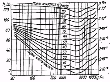 Порог слышимости наименьший в диапазоне 1-5 кГц. На частоте 1000 Гц пороговое значение интенсивности звука равно 10-12 Вт/м2, а давления – 2•10-5 Па. Как указывалось ранее, уровни этих величин приняты за нулевые.